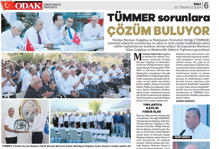 19 Temmuz 2024 Cuma günü Marmara Adası’nda Doğaltaş ve Madencilik Sektörü Toplantısı vesilesiyle sektörümüz ile bir araya geldik. Birliğimiz ve Marmara Mermerciler Madenciler ve İşadamları Derneği (MARMİAD) iş birliği ile gerçekleştirdiğimiz toplantımıza Kamudan bürokratlarımız ve özel sektör temsilcileri katılım sağladı. Toplantı öncesinde Maden Platformu başkanları, Marmara Adalar Belediyesi Başkanı Sn. Aydın Dinçer'i makamında ziyaret etti. Birliğimiz YK Başkanı Sn. Şimşek, Sn. Dinçer'e hediyesini takdim etti.