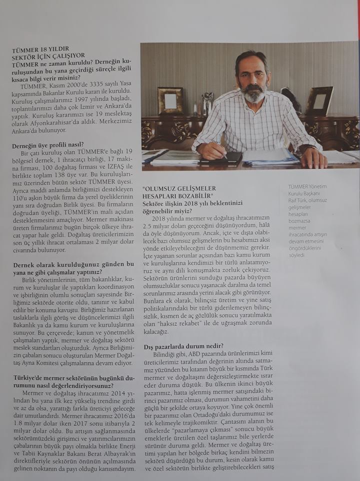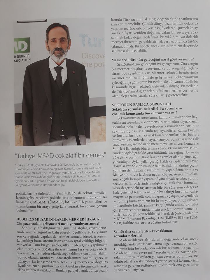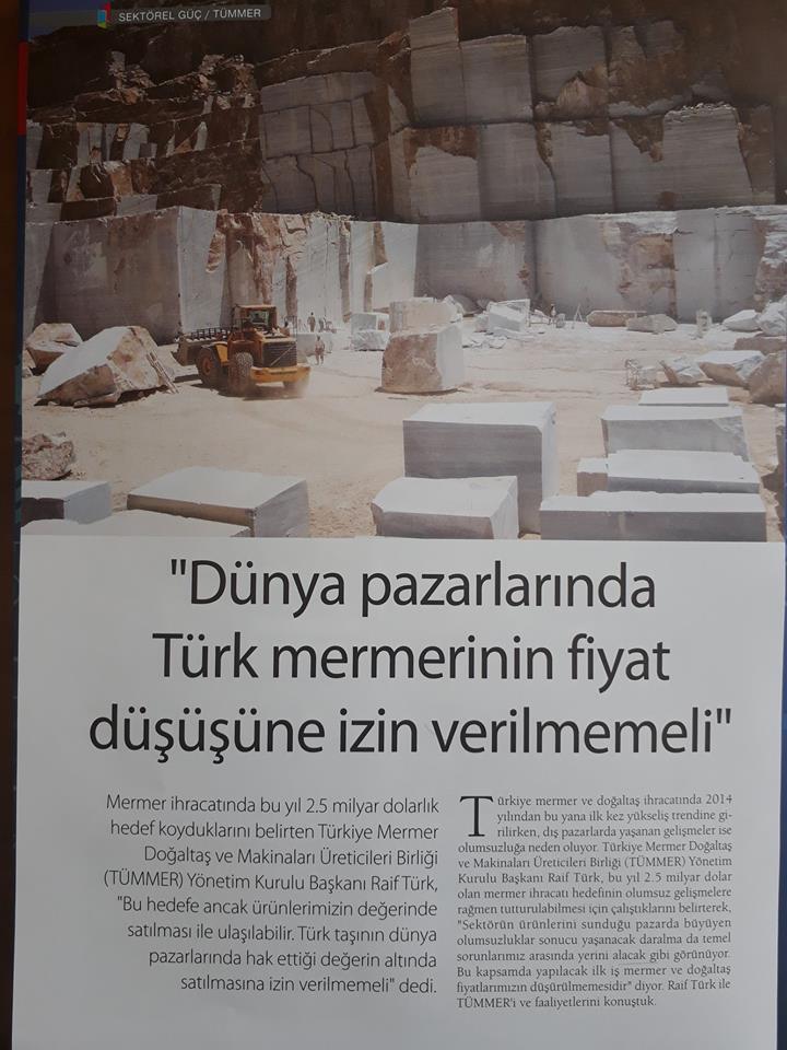 Başkanımız Sayın Raif TÜRK' ün, Türkiye İmsad Dergisi Temmuz ayı sayısında "Dünya pazarlarında Türk mermerinin fiyat düşüşüne izin verilmemeli" başlıklı söyleşisi yayınlandı.