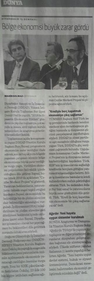 Diyarbakır Sanayi ve İş İnsanları Derneği (DİSİAD), Yüksek istişare Kurulu Toplantısı Sur İlçesi Demir Otel' de yapıldı. "2018' de Siyasetin Ekonomiye Etkileri" gündemiyle yapılan toplantıda, TÜMMER Başkanı Raif Türk: "Krediyle Borç Kapatmak Ekonomiye Çıkış Sağlamaz" dedi.