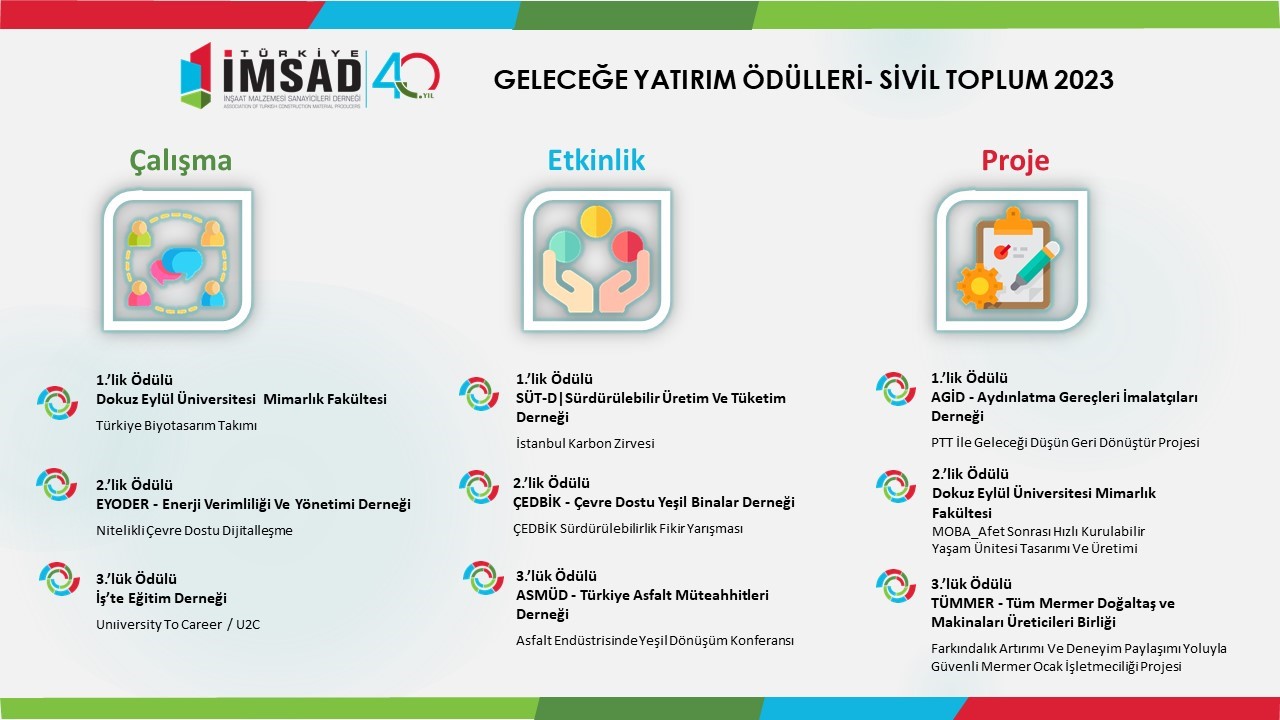 İnşaat malzemesi sektörünün çatı kuruluşu Türkiye İnşaat Malzemesi Sanayicileri Derneği (Türkiye İMSAD) tarafından düzenlenen Geleceğe Yatırım Ödülleri – Sivil Toplum 2023 kapsamında ödül alan projelerden biri de TÜMMER olarak 2021-2022 yıllarında yürütücüsü olduğumuz Farkındalık Artırımı ve Deneyim Paylaşımı Yoluyla Güvenli Mermer Ocak İşletmeciliği Projemiz oldu. CVK Park Bosphorus Hotel Istanbul’da gerçekleşen Türkiye İMSAD 40. Kuruluş Yıl Dönümü Kutlama Gecesi'nde Proje kategorisinde 3.'lük ödülümüz, YK Üyemiz ve Proje Yöneticimiz Sn. Süleyman Balıbey'e takdim edilmiştir.